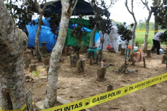 Polisi membongkar makam siswi SD di Grobogan yang diduga tewas dianiaya untuk keperluan autopsi, Senin (17/1). Humas Polda Jateng/Antara