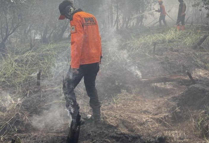 Petugas BPBD Kalsel memadamkan titik api karhutla di Kota Banjarbaru, Sabtu (24/6).