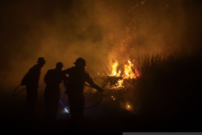 Petugas gabungan melakukan pemadaman titik api akibat kebakaran hutan dan lahan (karhutla) di Kota Banjarbaru, Kalimantan Selatan.