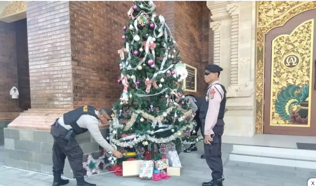 JAGA KEAMANAN: Polisi saat melakukan sterilisasi di Gereja Paroki Santo Paulus, Singaraja. (eka prasetya/radarbali.id)