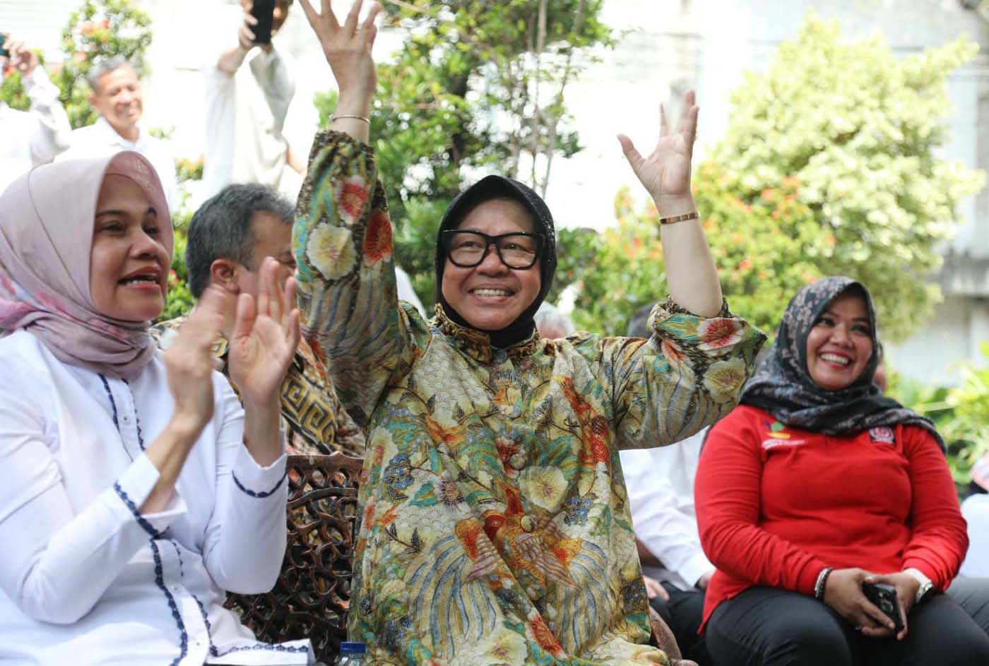 Menteri Sosial Tri Rismaharini bersama karyawan Kemensos saat mendengarkan Konser Musisi Jalanan di Kantor Kemensos, Jakarta, Kamis (29/8/2024). (Fedrik Tarigan/ Jawa Pos)