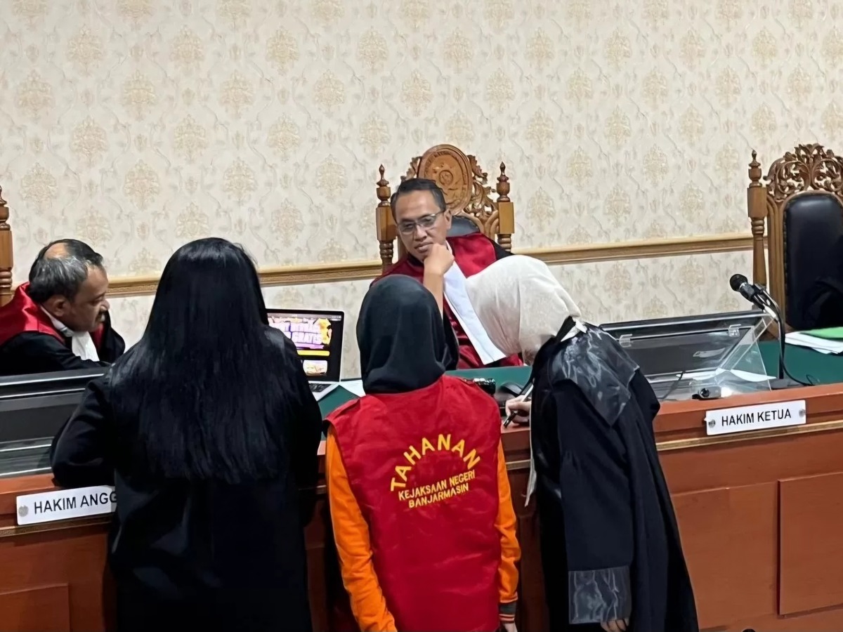 PERIKSA BUKTI: Terdakwa Septia Rahayu diperlihatkan barang bukti oleh jaksa penuntut umum kepada majelis hakim PN Banjarmasin, Senin (20/10). (Foto: Muhammad Oscar Fraby/Radar Banjarmasin)
