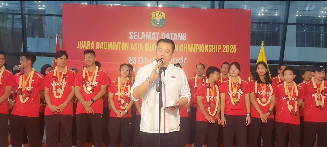 Foto: Kabid Binpres PP PBSI, Eng Hian saat menyambut tim Indonesia yang juara Badminton Asia Mixed Team Championships 2025. (Dimas Ramadhan/JawaPos.com)