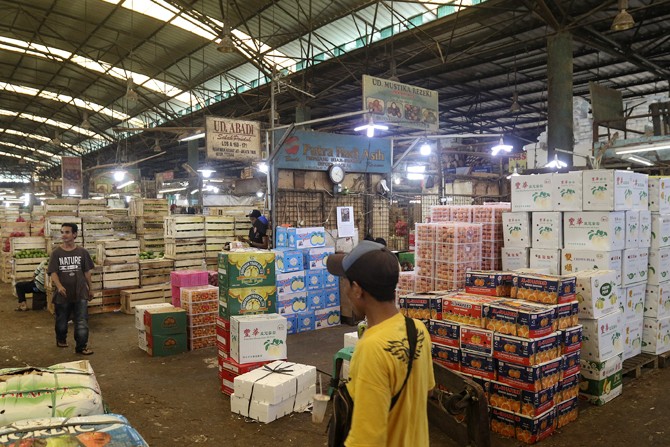 Suasana aktifitas pasar induk Kramat Jati di Blok buah, Jakarta, (31/1/2020). Kementerian Pertanian memperketat pintu masuk impor berbagai jenis makanan termasuk buah-buahan dari negara tertentu yang kemungkinan terkontaminasi virus corona sebagai upaya