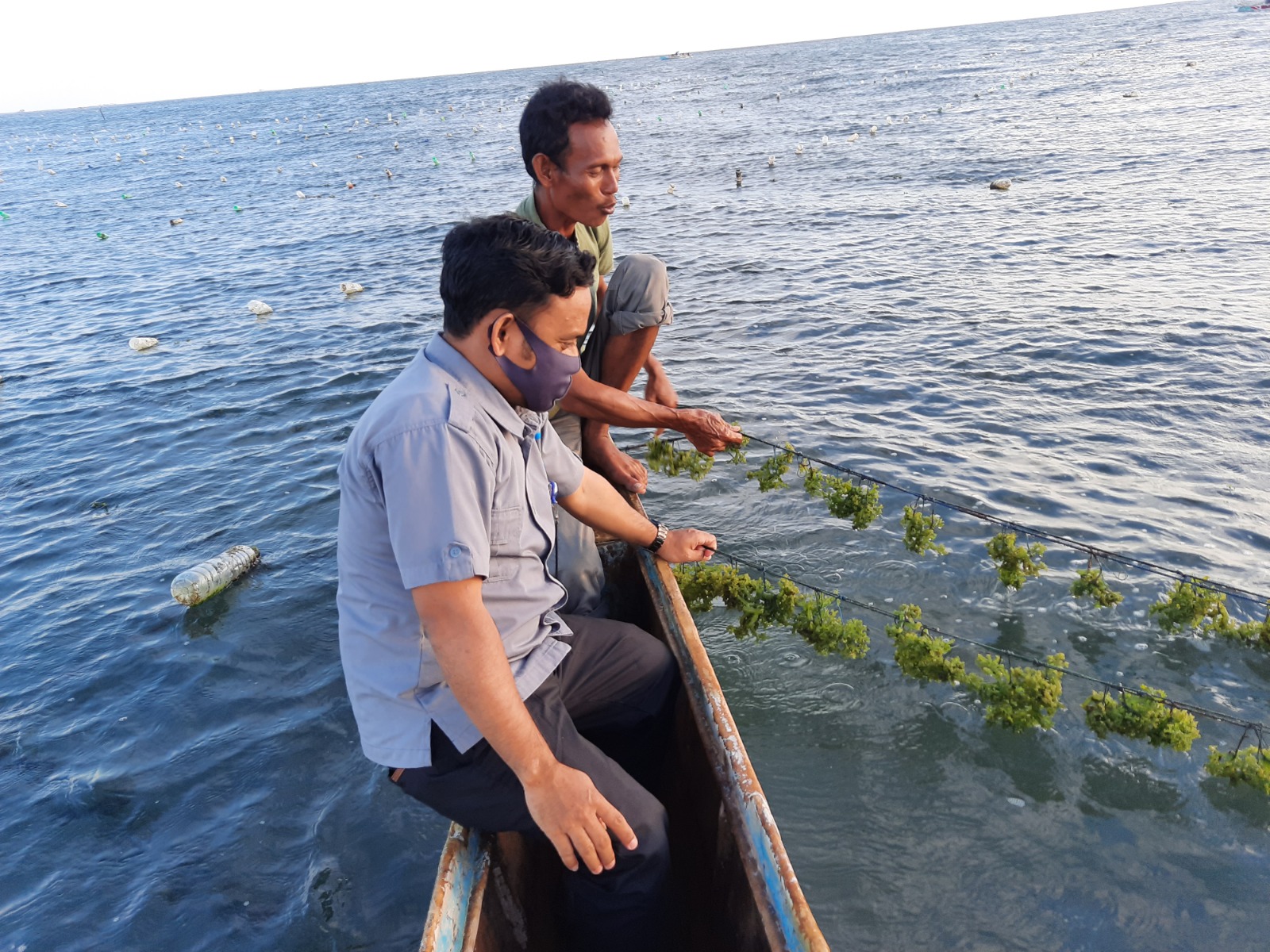 Petani sedang memanen rumput laut. Mereka anggota Pokdakan Sinar Laut Jeneponto.