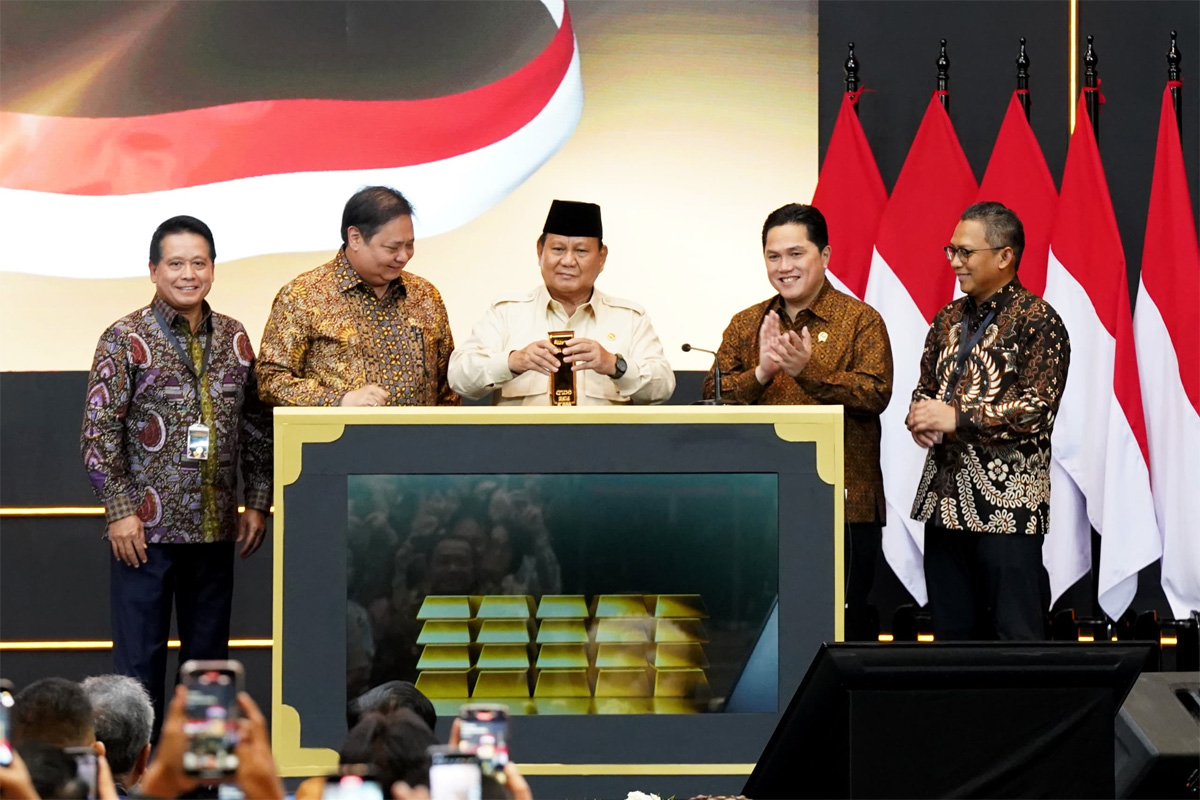 Presiden Prabowo Subianto meresmikan layanan Bank Emas didampingi Dirut BSI Hery Gunardi, Menko Perekonomian Airlangga Hartanto, Menteri BUMN Erick Thohir dan Dirut PT Pegadaian Damar Latri Setiawan.