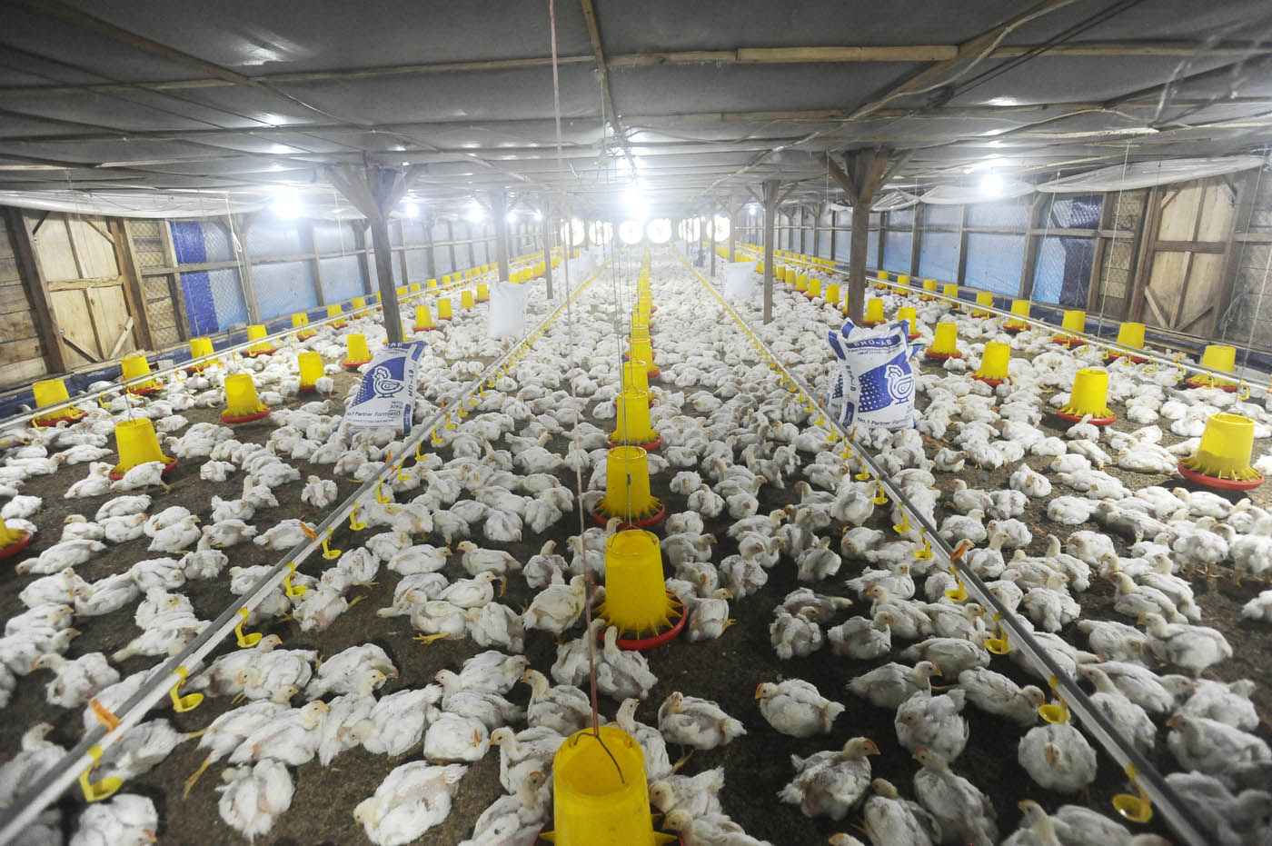 Pekerja memberikan pakan ayam broiller di peternakan ayam closed house yang ramah lingkungan di Nanggung, Bogor, Jawa Barat. (Dery Ridwansah/ JawaPos.com)