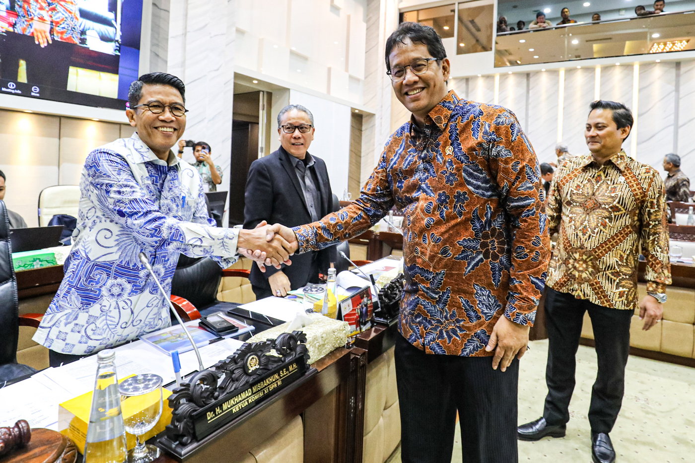 Menteri Keuangan Purbaya Yudhi Sadewa (kedua kanan) di dampingi Wakil Menteri Keuangan Thomas A. M. Djiwandono (kanan) berjabat tangan dengan Ketua Komisi XI DPR Mukhamad Misbakhun (kiri) sebelum mengikuti rapat kerja di Kompleks Parlemen, Senayan, Jakart
