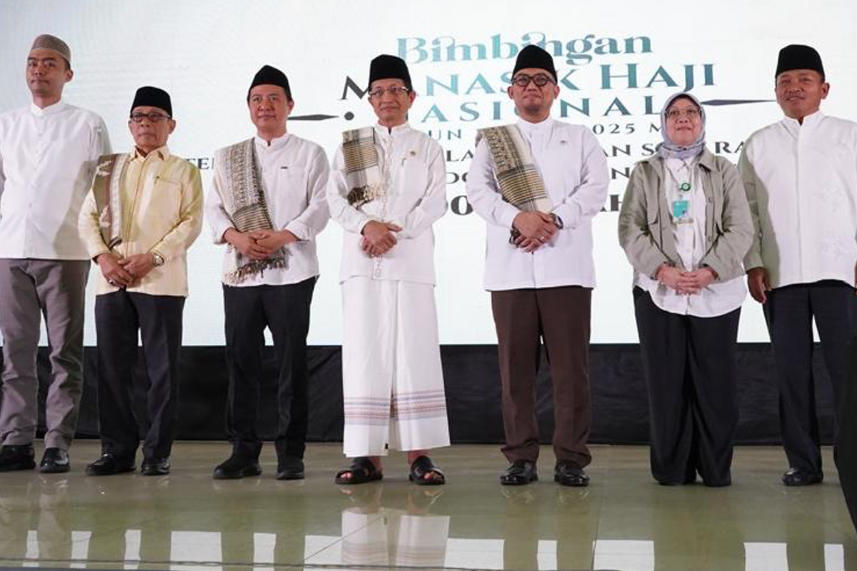 Menag Nasaruddin Umar (empat dari kiri) saat membuka bimbingan manasik haji nasional. (Media Center Haji 2025)