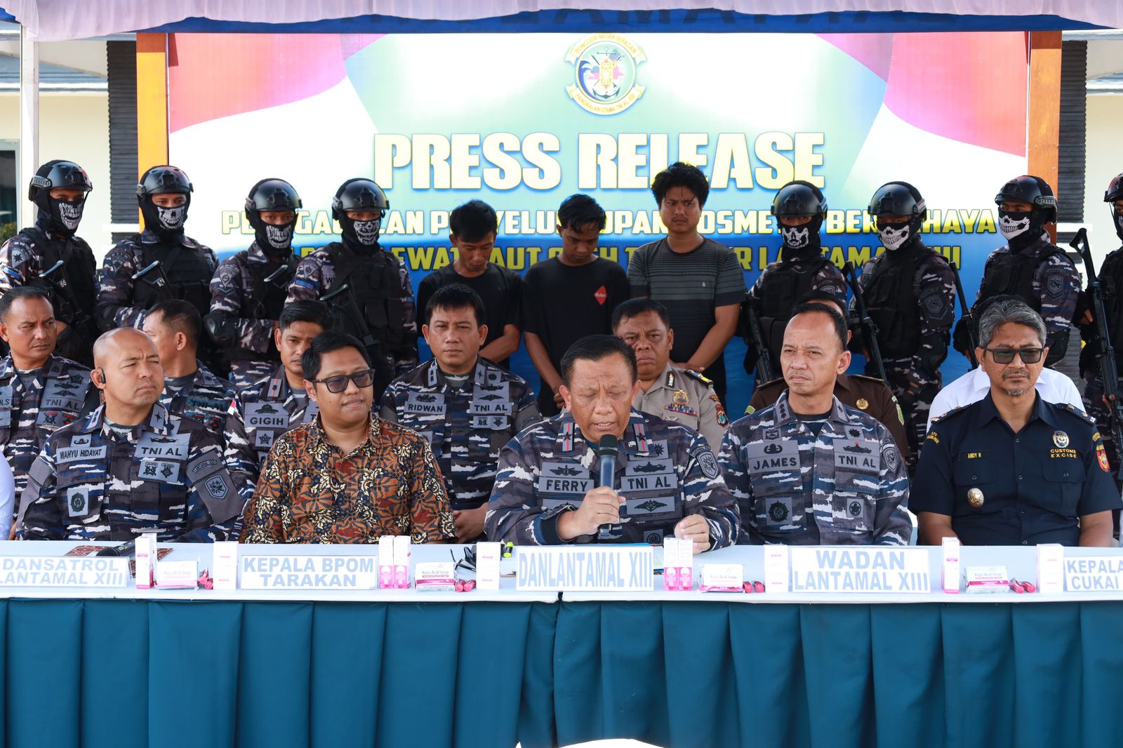 Danlantamal XIII Laksamana Pertama TNI Ferry Supriady bersama aparat keamanan terkait lainnya menunjukkan barang bukti kosmetik ilegal yang hendak diselundupkan dari Malaysia. (Foto: TNI AL)