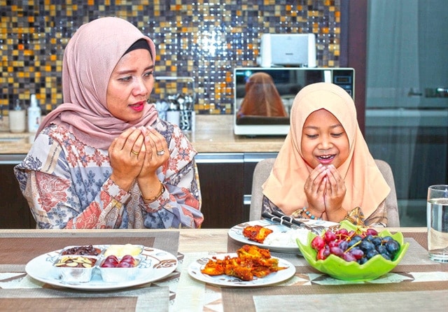 Ilustrasi seseorang Ibu dan anaknya tengah berdoa saat berbuka puasa di rumah.