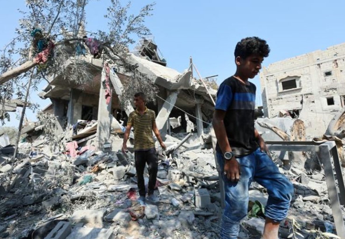 Warga Palestina memeriksa sebuah rumah yang hancur akibat serangan Israel di Jalur Gaza Tengah (9/7)