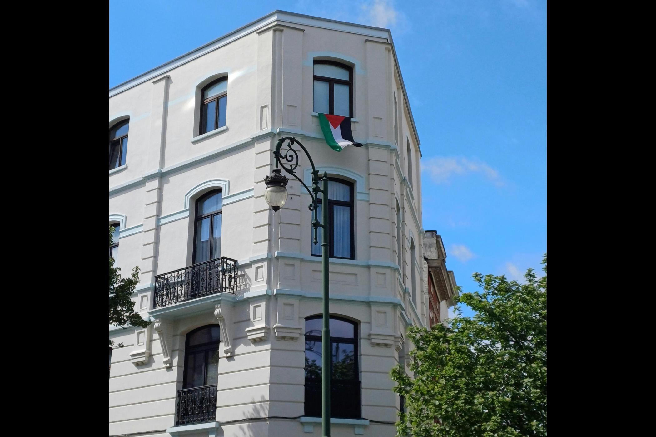 Bendera Palestina dikibarkan di jendela salah satu gedung di Brussels, Belgia. Belgia berencana mengakui negara Palestina di PBB. (Pexels)