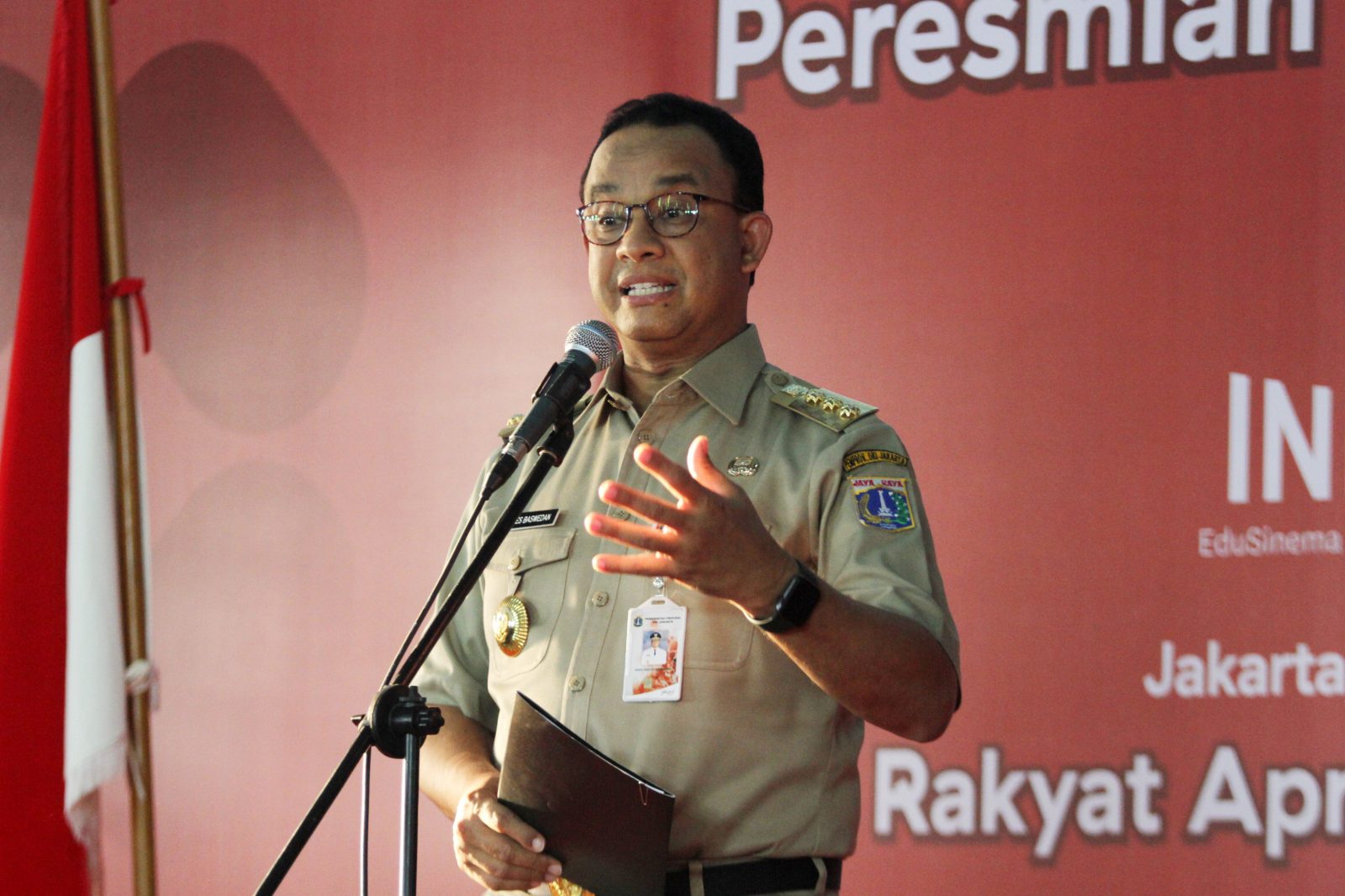 Gubernur DKI Jakarta Anies Baswedan saat peresmian Bioskop Rakyat di Pasar Teluk Gong, Jakarta, Senin (7/10/2019). Bioskop rakyat, Indiskop, yang memutar film-film Indonesia ini merupakan garapan Perumda Pasar Jaya yang bekerja sama dengan Persatuan Artis