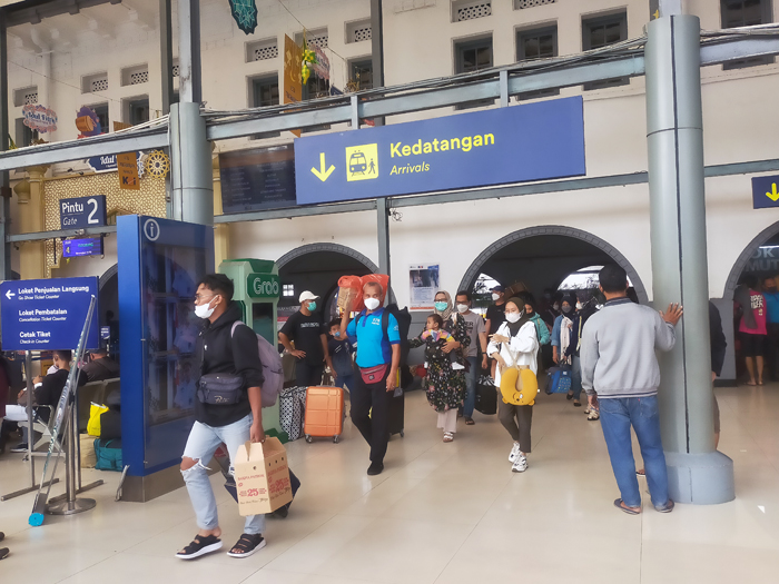 Sejumlah pemudik tiba di Stasiun Pasar Senen, Jakarta Pusat, pada Minggu (30/4)