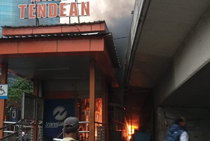 Kebakaran melahap halte Bus Transjakarta Tendean di Jalan Kapten Tendean, Mamprang Prapatan, Jakarta Selatan. Api membesar sekitar pukul 16.45 WIB.