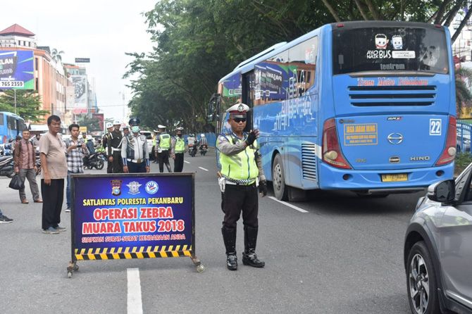 Satuan Lalu Lintas Polresta Pekanbaru, menggelar Operasi Zebra Muara Takus 2018 di depan Ramayana, Jalan Jenderal Sudirman, Pekanbaru, Riau, Selasa (30/10).