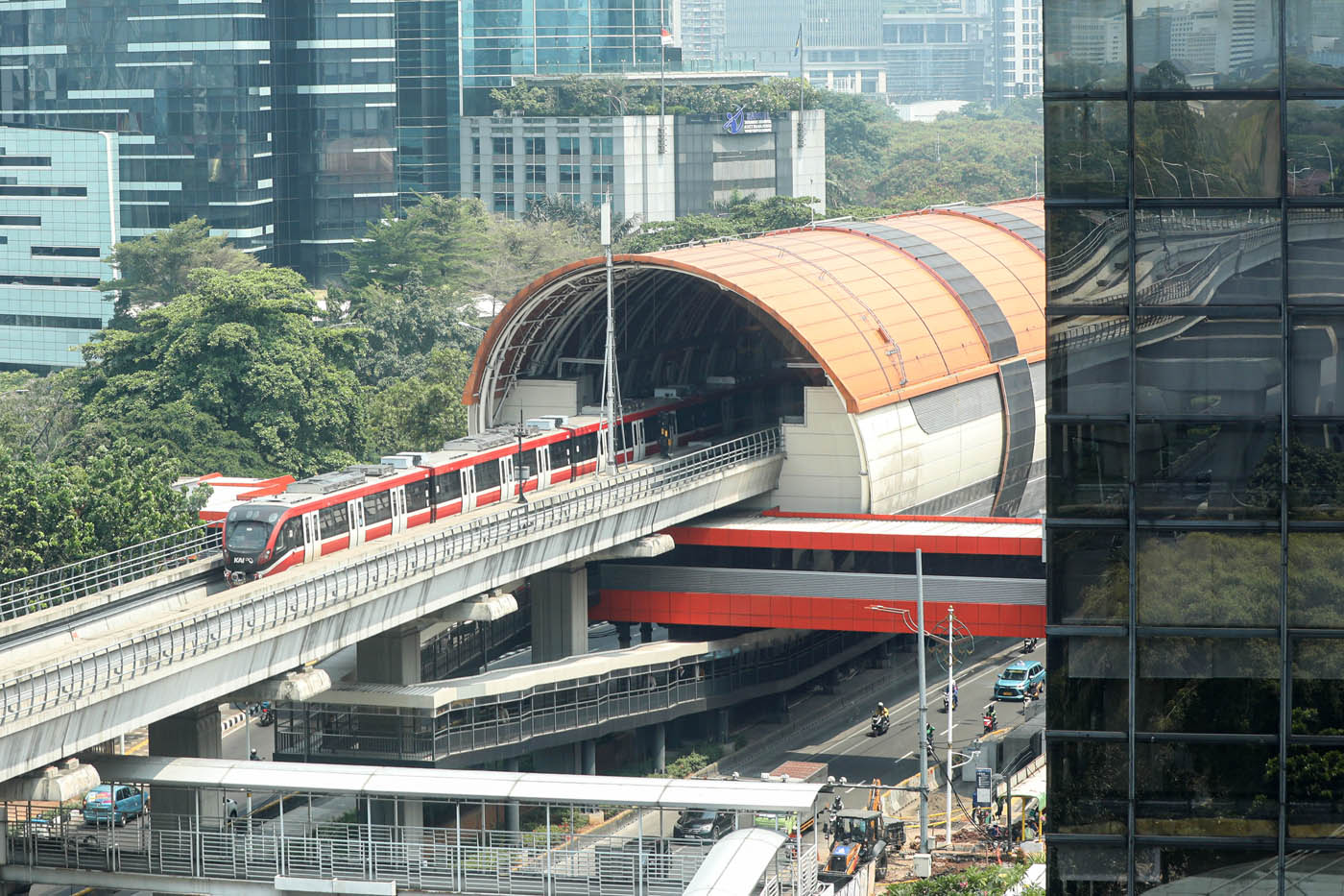 Kereta LRT Jabodebek melintas di kawasan Kuningan, Jakarta, Rabu (16/10/2024). (Salman Toyibi/Jawa Pos)
