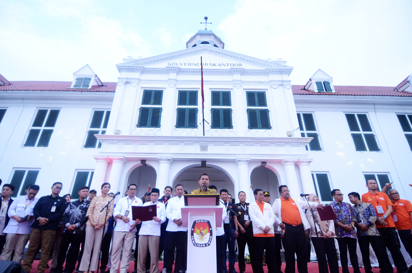 Ketua KPU DKI Jakarta Wahyu Dinata bersama Ketiga paslon Gubernur dan Wakil Gubernur Jakarta, Ridwan Kamil-Suswono, Dharma Pongrekun-Kun Wardana dan Pramono Anung-Rano Karno saat Deklarasi Damai di Kota Tua, Jakarta, Selasa, (24/9/2024). (Dery Ridwansah/