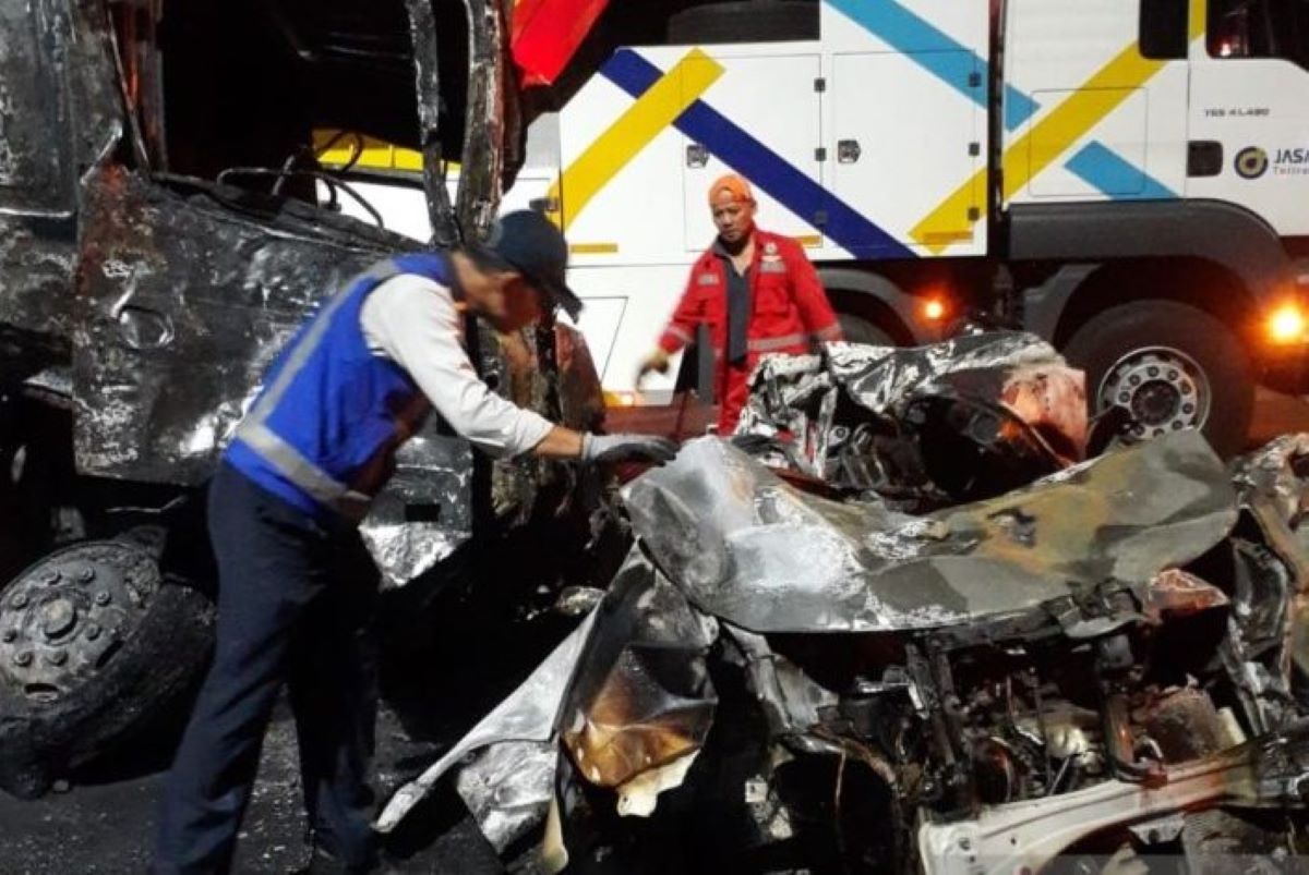Petugas menangani lokasi kecelakaan di Gerbang Tol Ciawi, Kelurahan Katulampa, Kota Bogor, Rabu (5/2). (Damkar Kota Bogor/Antara)