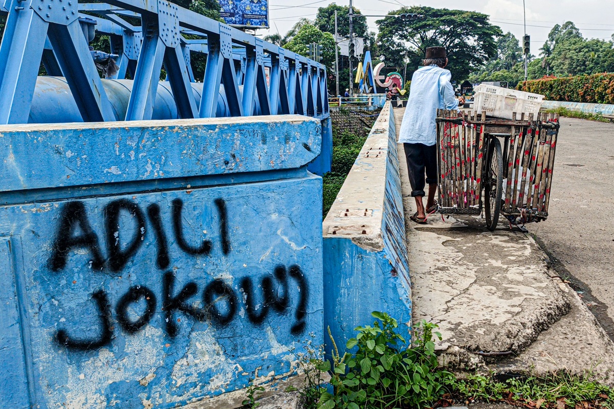 Sebuah coretan Adili Jokowi tertulis di sebuah jembatan di Jalanan Bouraq, Kota Tangerang, Selasa (18/02/2025). (HANUNG HAMBARA/JAWA POS)