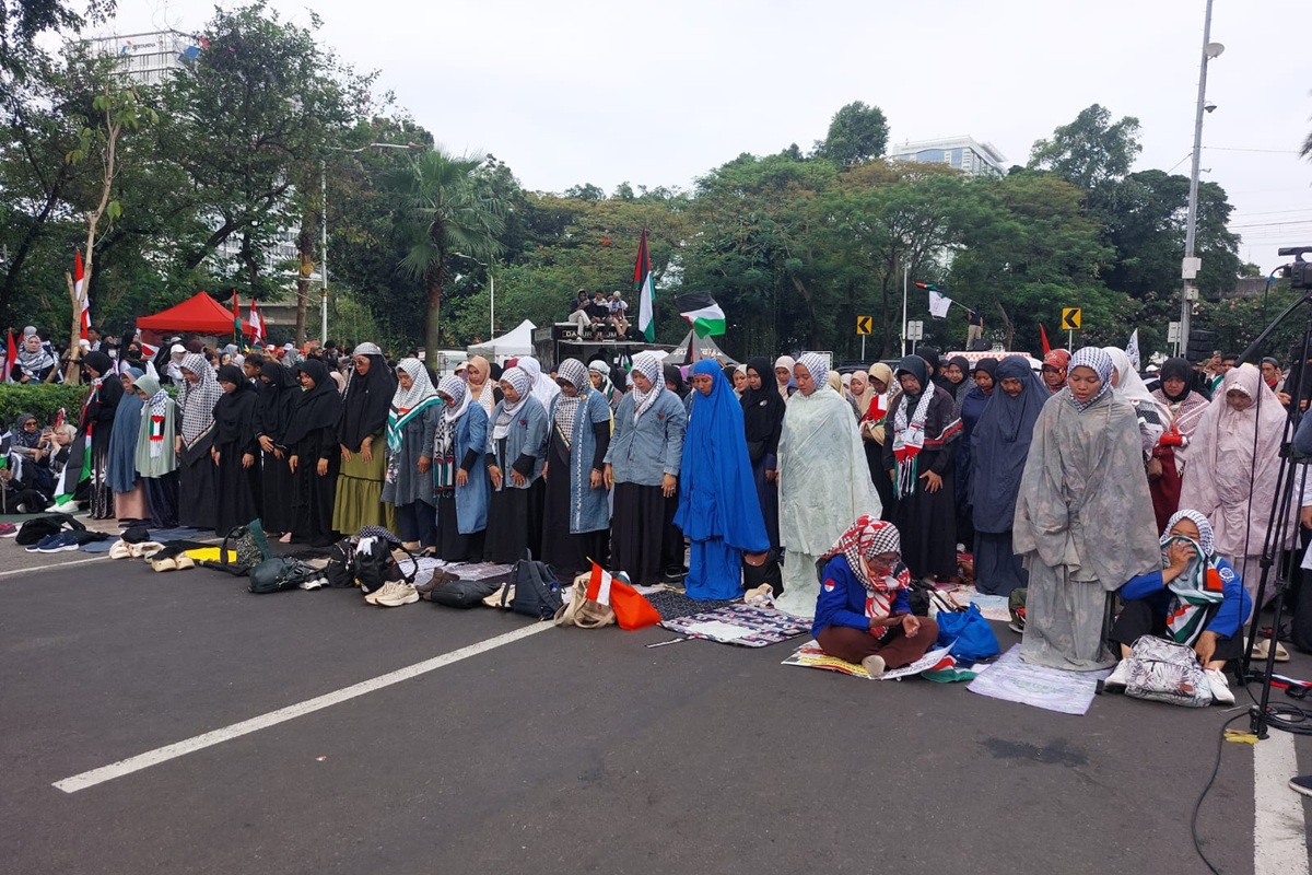 Ratusam massa aksi bela Palestina menggelar salat Ashar berjamaah di depan kantor Kedutaan Besar Amerika Serikat (AS) di Jakarta Pusat, Selasa (7/10). (Ryandi Zahdomo/JawaPos.com)