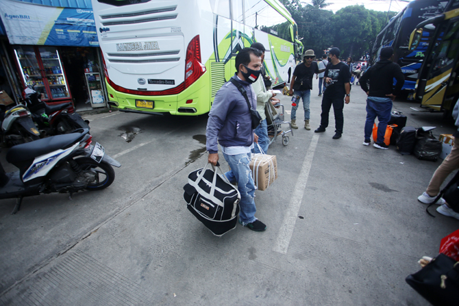 Calon penumpang menunggu kedatangan bus antarkota antarprovinsi (AKAP) di Terminal Bus Lebak Bulus, Jakarta, Senin (11/4/2022). Sejumlah masyarakat memilih mudik ke kampung halaman lebih awal untuk menghindari kemacetan dan harga tiket yang tinggi. Foto: Dery Ridwansah/ JawaPos.com