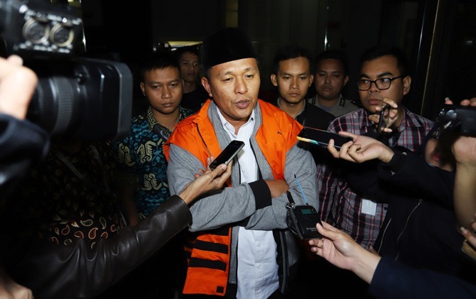 Bupati Lampung Tengah, Mustafa, saat akan dilakukan penahanan Jumat (16/2) dini hari