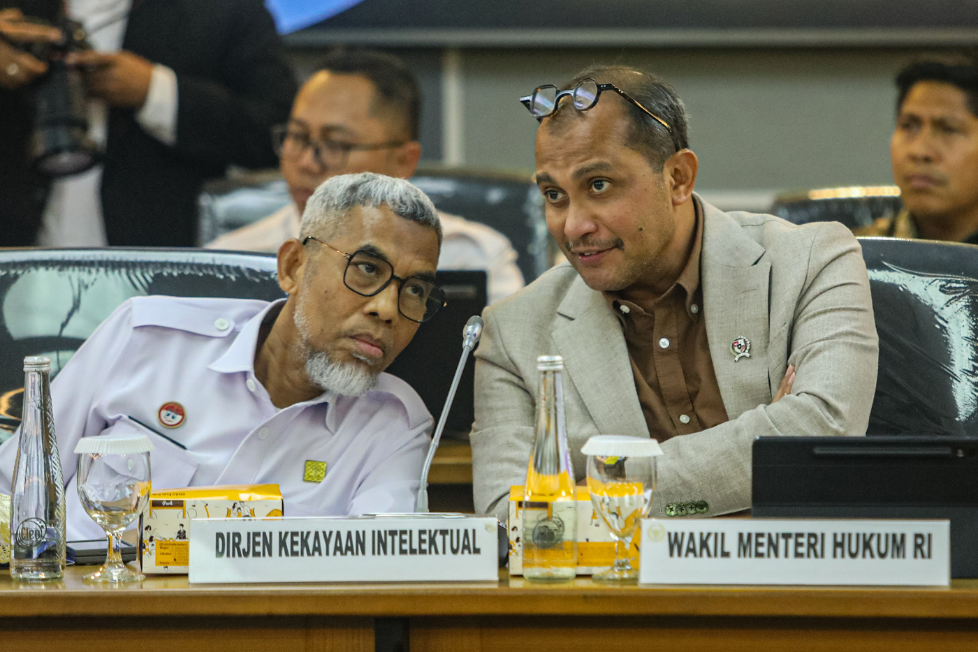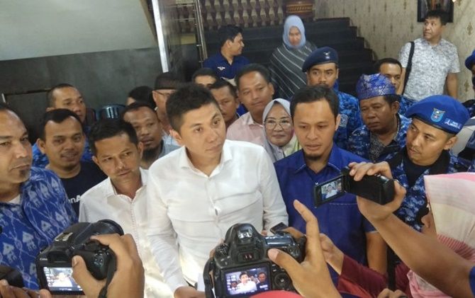 Wakil Sekjen Partai Demokrat Jansen Sitindaon (baju putih) heran dengan Eddy Hiariej yang bisa tersandung kasus korupsi. Menurutnya, gaji Eddy sebagai Wamenkumham harusnya lebih dari cukup.