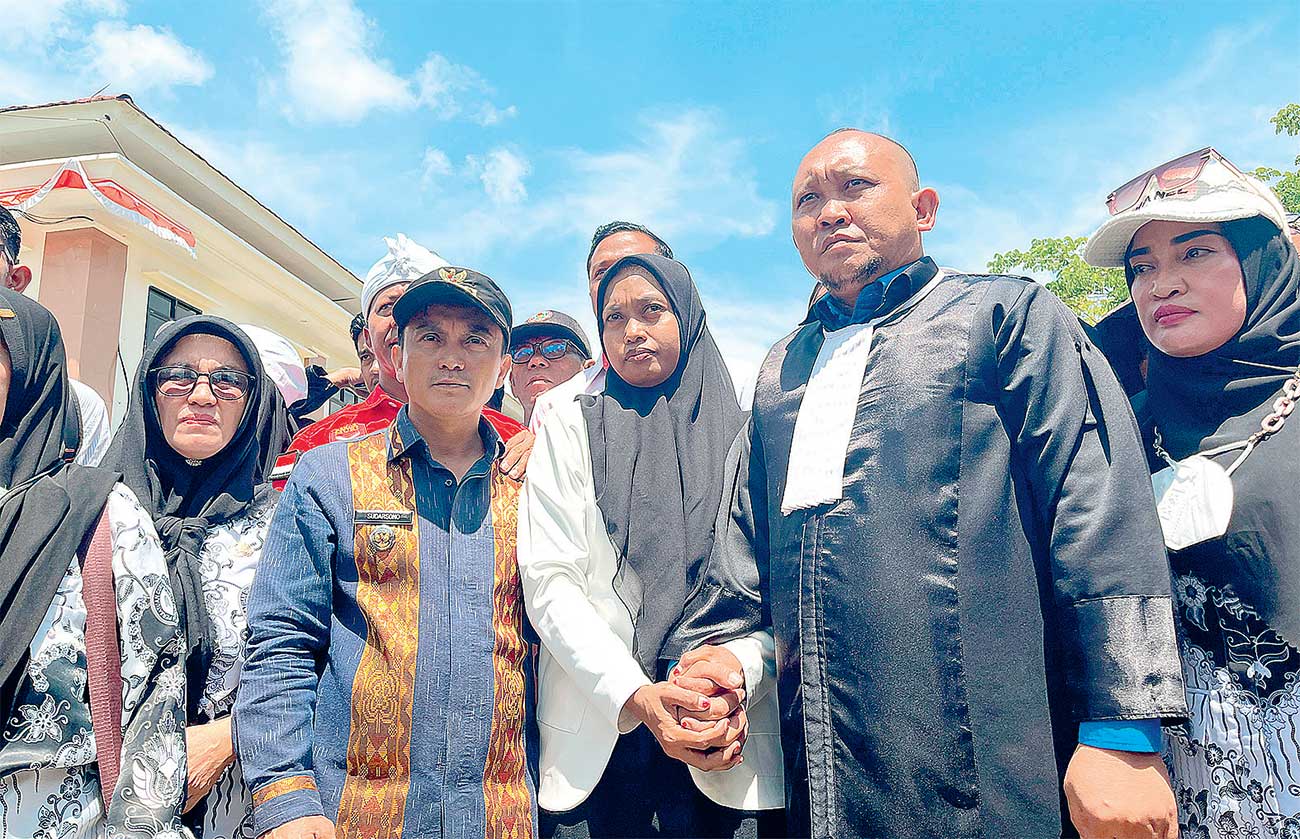 SOLIDARITAS: Supriyani (tengah, berjilbab hitam) didampingi kuasa hukum Samsuddin SH (dua dari kanan) dan sejumlah guru saat tiba di PN Andoolo, Konawe Selatan, Sulawesi Tenggara, kemarin.