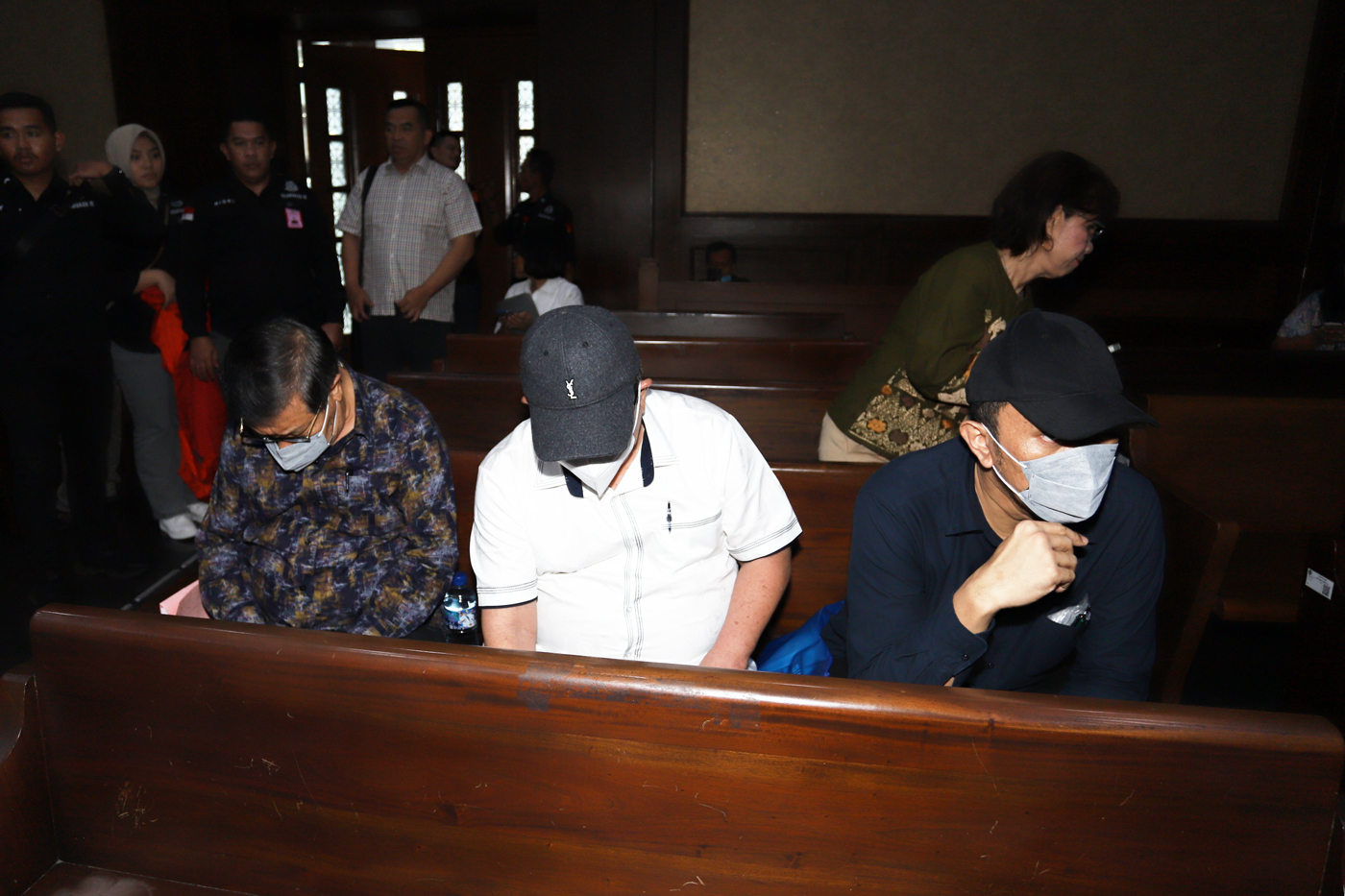 Tiga hakim nonaktif Pengadilan Negeri Surabaya pemberi vonis bebas kepada Gregorius Ronald Tannur yakni Erintuah Damanik (kiri), Mangapul (tengah), dan Heru Hanindyo (kanan) bersiap menjalani sidang perdana dengan agenda pembacaan surat dakwaan di Pengadi