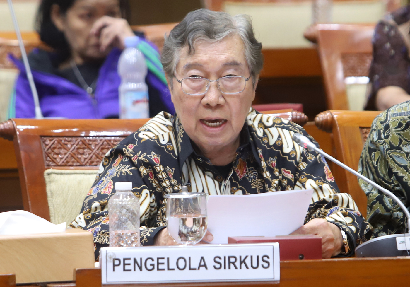 Pendiri Oriental Circus Indonesia (OCI) Jansen Manansang mengikuti rapat dengar pendapat umum (RDPU) dengan Komisi III DPR di Kompleks Parlemen, Senayan, Jakarta, Senin (21/4/2025). (Dery Ridwansah/ JawaPos.com)