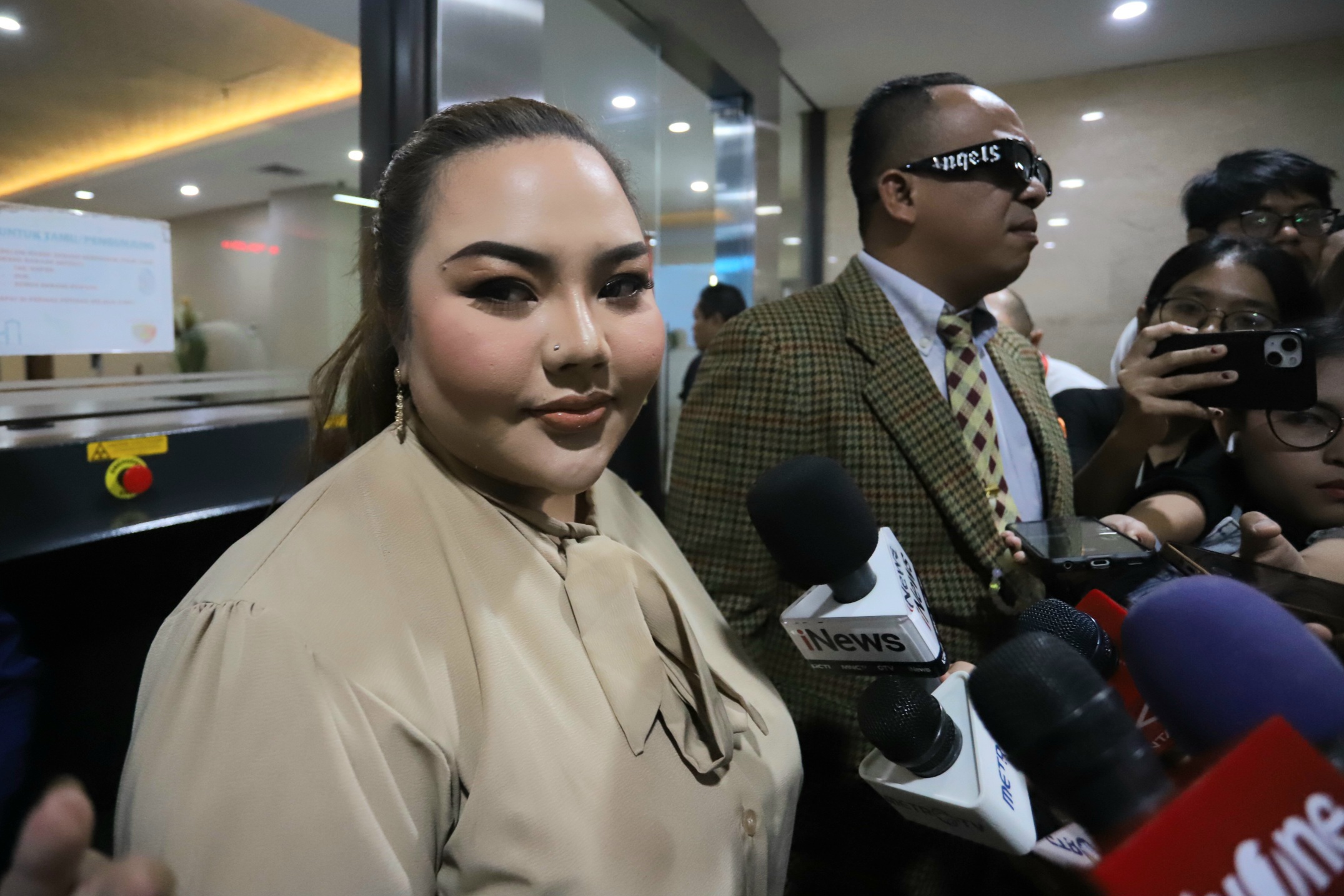 Lisa Mariana bersama kuasa hukum tiba di Gedung Bareskrim Polri untuk tes DNA, Jakarta, Kamis (7/8/2025). (Dery Ridwansah/ JawaPos.com)