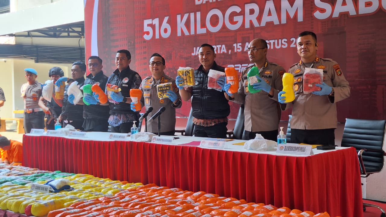 Direktorat Reserse Narkoba Polda Metro Jaya mengungkap peredaran gelap narkoba jenis sabu seberat 516 kilogram. (Syahrul Yunizar/JawaPos.com)