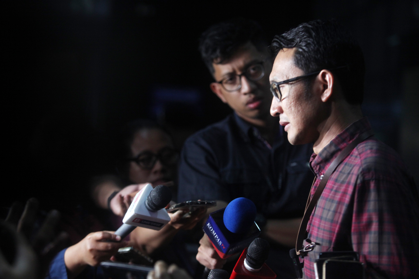 Bupati Lampung Tengah Ardito Wijaya (tengah) dihadirkan saat konferensi pers penahanan di Gedung KPK, Jakarta, Rabu (11/12/2025). (Salman Toyibi/Jawa Pos)