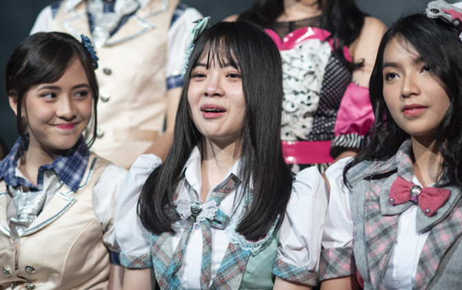 Cindy Yuvia (tengah) saat menyampaikan ketakutannya ketika menjadi center Tim J bersama Zara (kiri) dan Gracia (kanan) di Teater JKT48, Minggu (27/5).