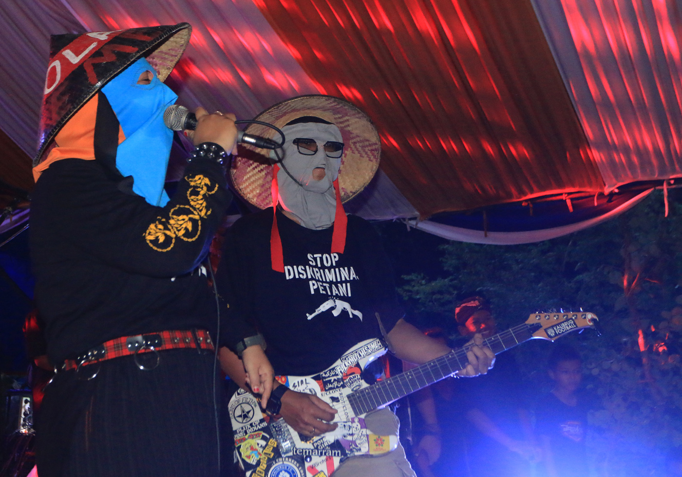 Vokalis Band Sukatani dengan nama panggung Twister Angel dan gitaris Alectroguy memainkan lagu saat pementasan budaya bertajuk Nyawiji Bumi di lereng Pegunungan Kendeng, Desa Gadudero, Kecamatan Sukolilo, Kabupaten Pati, Jawa Tengah, Senin (21/4/2025). (