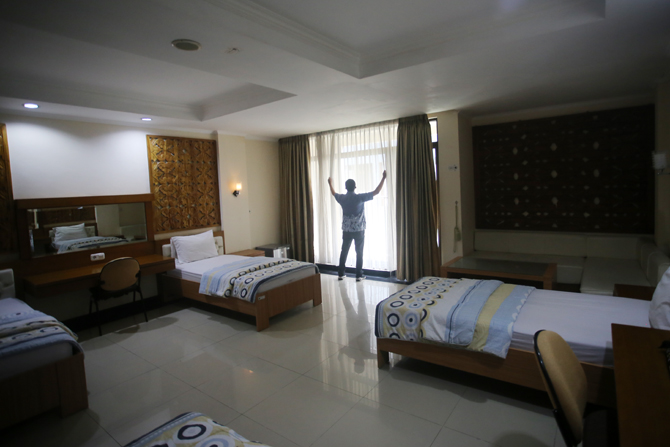 Petugas merapikan kamar untuk jemaah umrah di Asrama Haji, Pondok Gede, Jakarta Timur, Rabu (1/12/2021). Kementerian Agama menyiapkan Asrama Haji Pondok Gede sebagai tempat karantina jemaah umrah dan akan menerapkan kebijakan satu pintu pemberangkatan jem