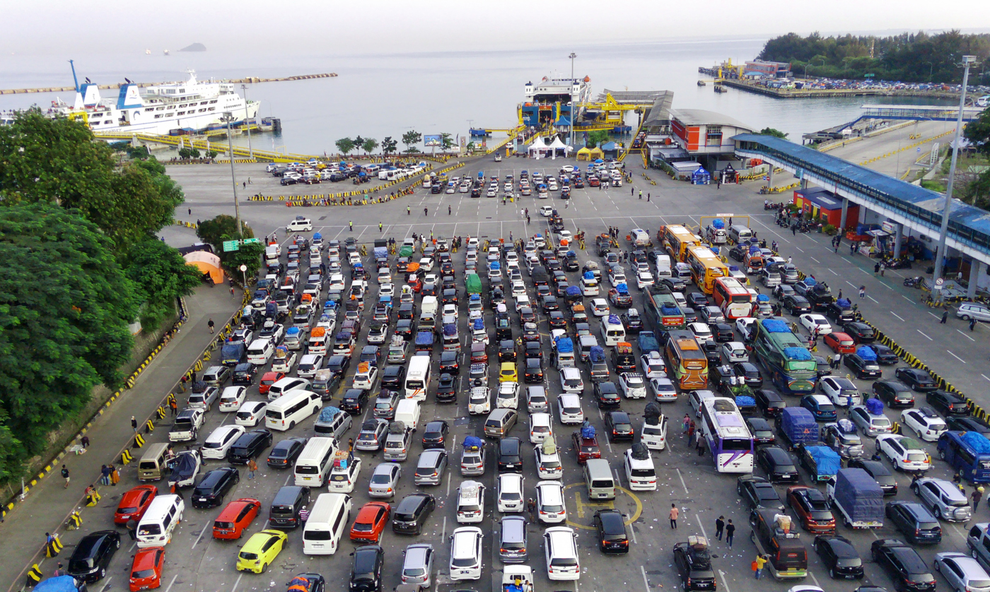 Antrean mobil pribadi dan bus berisi pemudik menunggu kapal di Pelabuhan Merak, Banten, Rabu (19/4/2023).