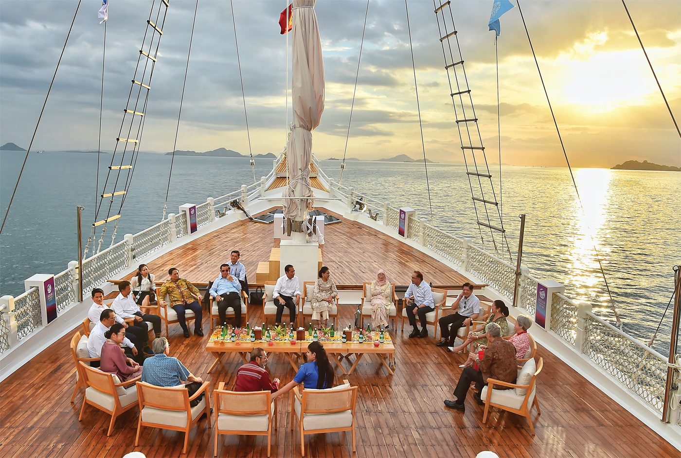 NIKMATI SUNSET: Presiden Joko Widodo bersama para pemimpin negara peserta KTT Ke-42 ASEAN menikmati joy sailing di Labuan Bajo, Rabu (10/5).