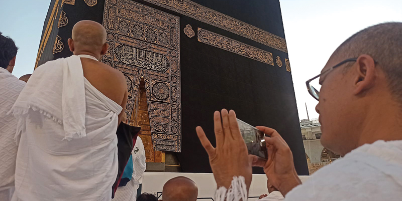 BERIBADAH: Jemaah di depan Kakbah menjelang salat Magrib di Masjidiharam kemarin. Jemaah diimbah tidak berlebihan saat membuat dokumentasi. (NAUFAL WIDI/JAWA POS)