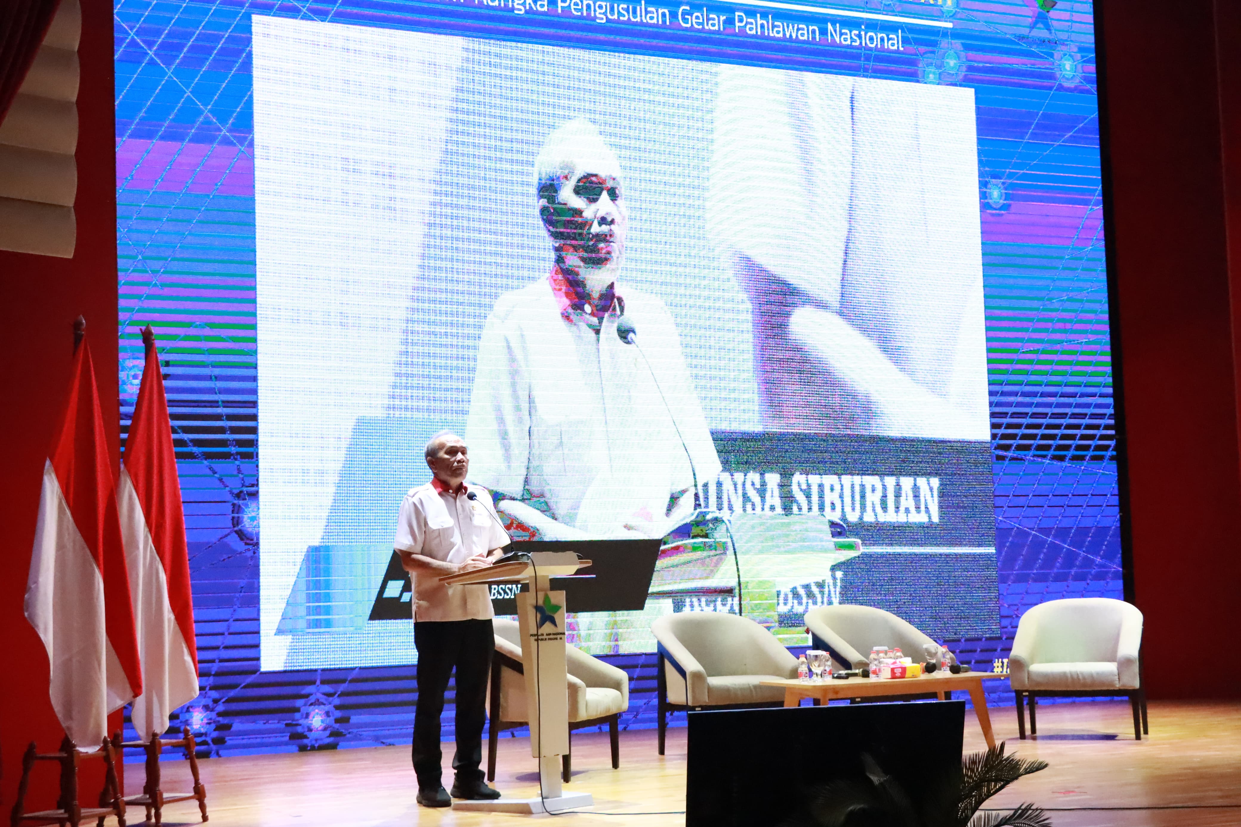Kepala BSSN Hinsa Siburian dalam seminar nasional ‘Bedah Juang Mayjen TNI dr. Roebiono Kertopati’ di Perpustakaan Nasional, Jalan Medan Merdeka Selatan, Jakarta, Kamis (21/12/2023). (Istimewa)