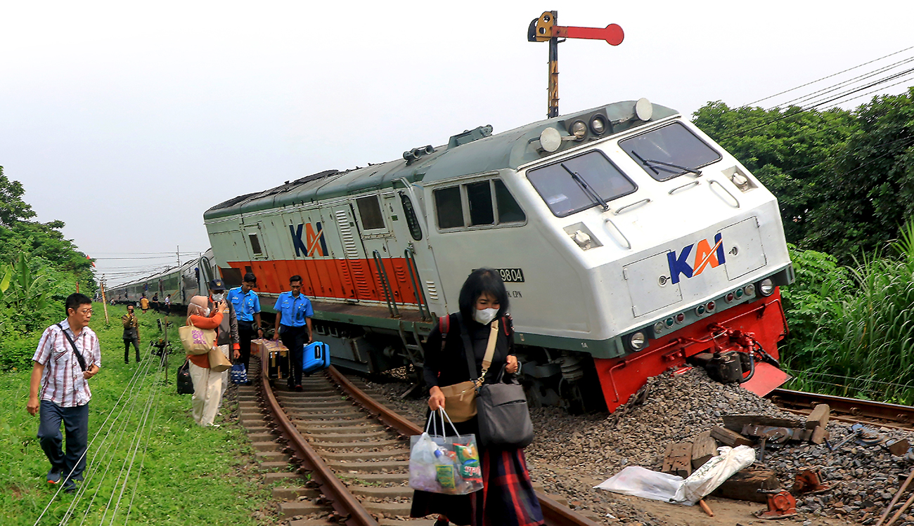 KELUAR REL: Penumpang KA Pandalungan dievakuasi setelah anjloknya lokomotif dan dau gerbong di emplasemen Stasiun Tanggulangin, Sidoarjo, kemarin (14/1).