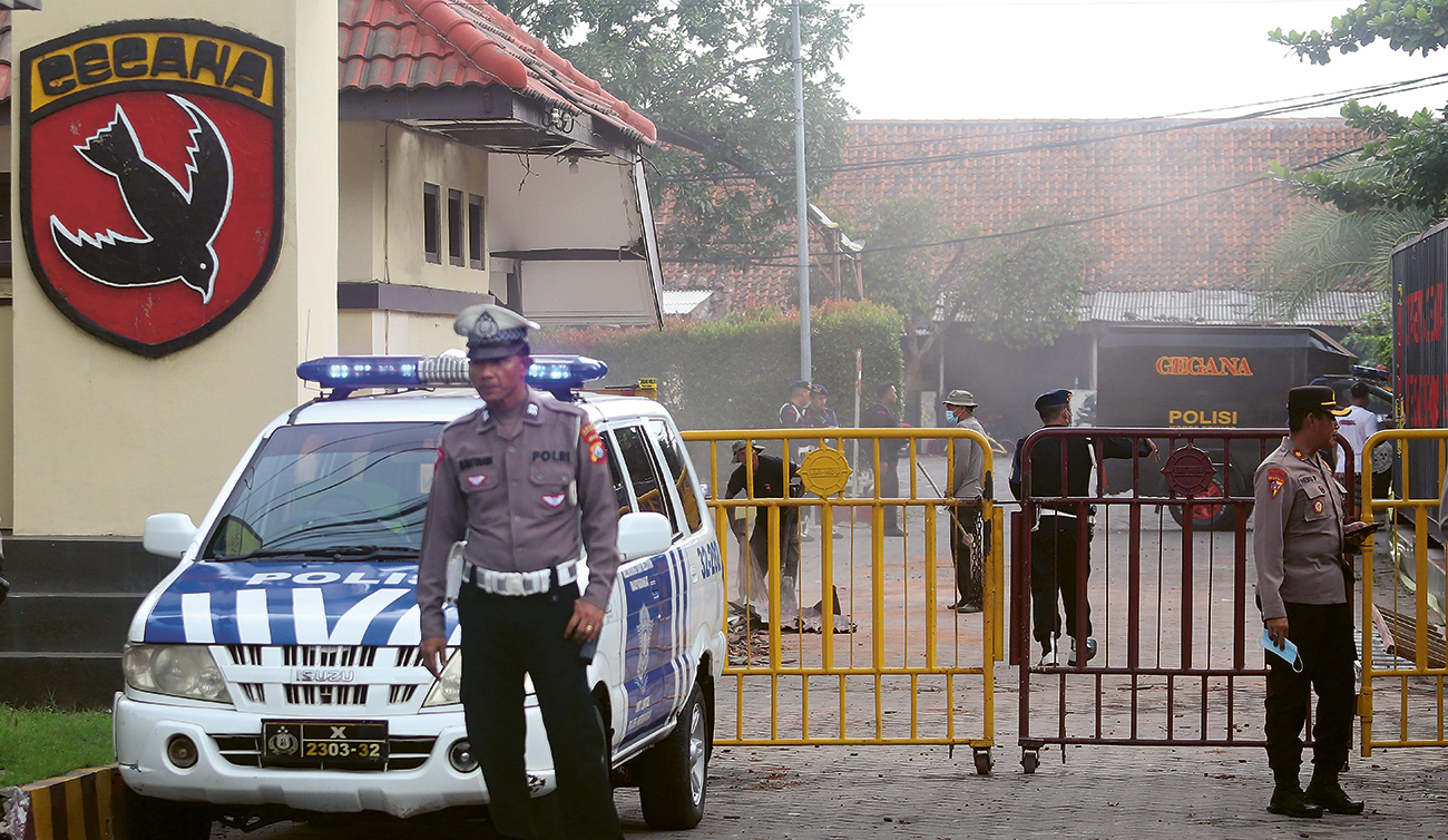 DIJAGA KETAT: Pembersihan sisa atap kantor yang rusak akibat ledakan di Mako Detasemen Gegana Brimob Polda Jatim, Jalan Gresik, Surabaya, Senin (4/3).