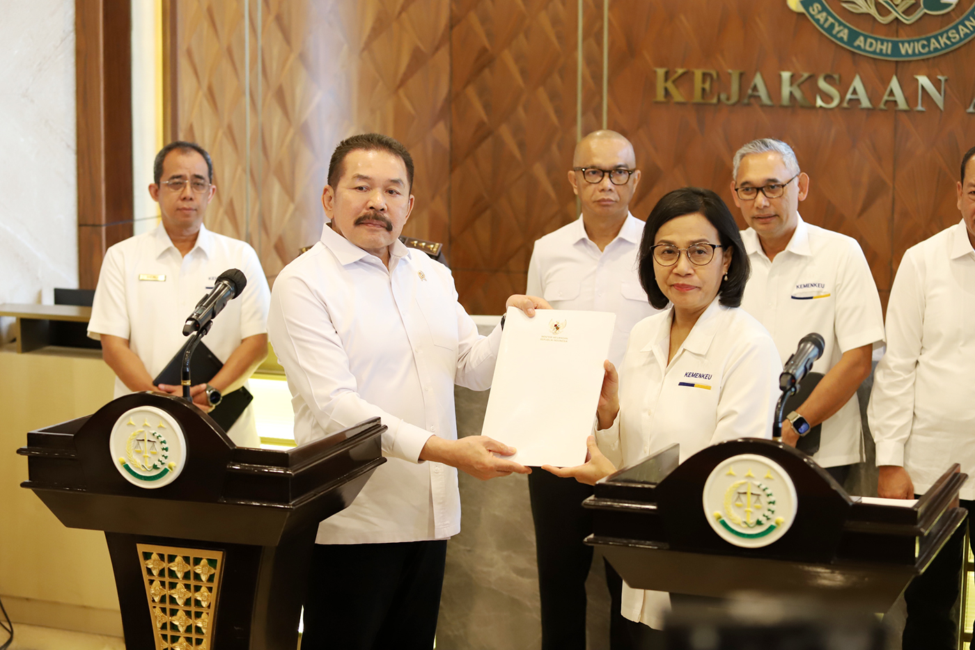 Jaksa Agung Sanitiar Burhanuddin bersama dengan Menteri Keuangan Sri Mulyani memberikan keterangan pers terkait laporan Menkeu mengenai dugaan tindak pidana korupsi pada Lembaga Pembiayaan Ekspor Indonesia (LPEI) di Kejaksaan Agung, Jakarta, Senin (18/3/