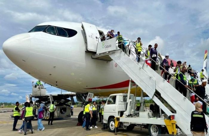 Kedatangan pesawat Garuda Indonesia jenis A340-300 yang mengangkut 319 jamaah haji. Firman/Antara