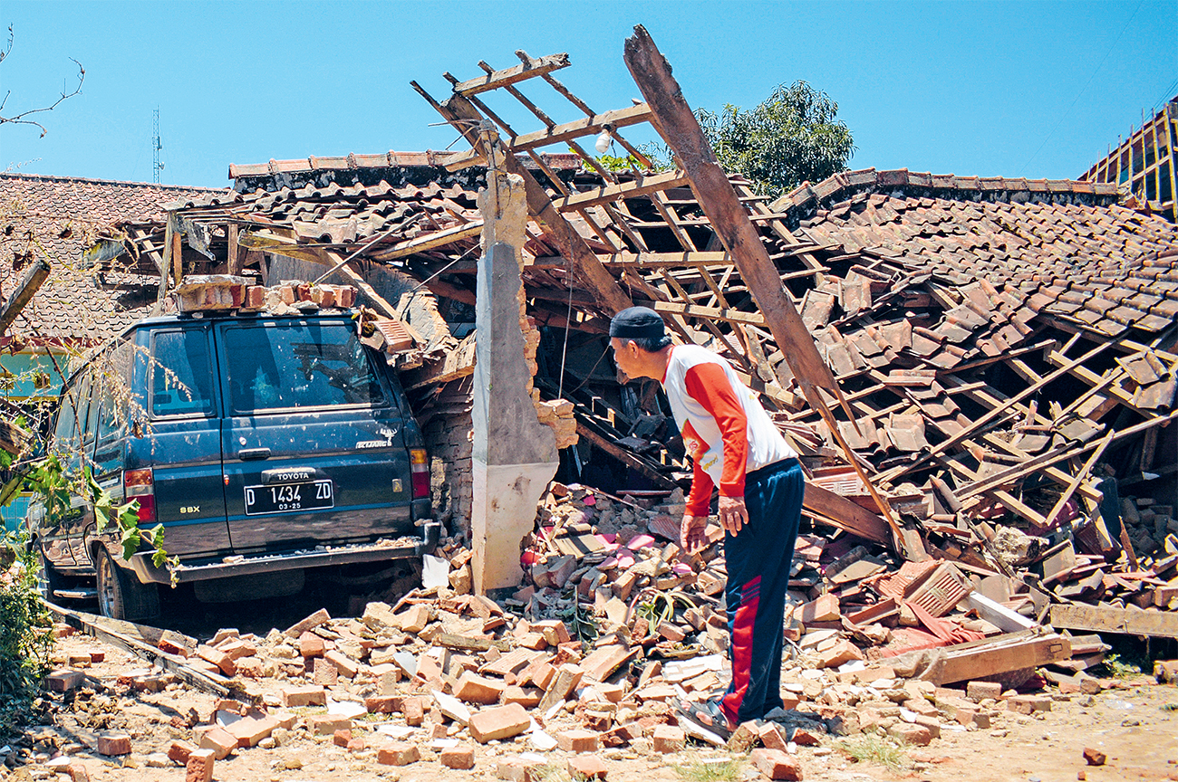 RUSAK BERAT: Rumah warga roboh akibat gempa berkekuatan magnitudo 4,9 yang melanda Kertasari, Bandung, Jawa Barat, kemarin (18/9). (TIMUR MATAHARI/AFP)