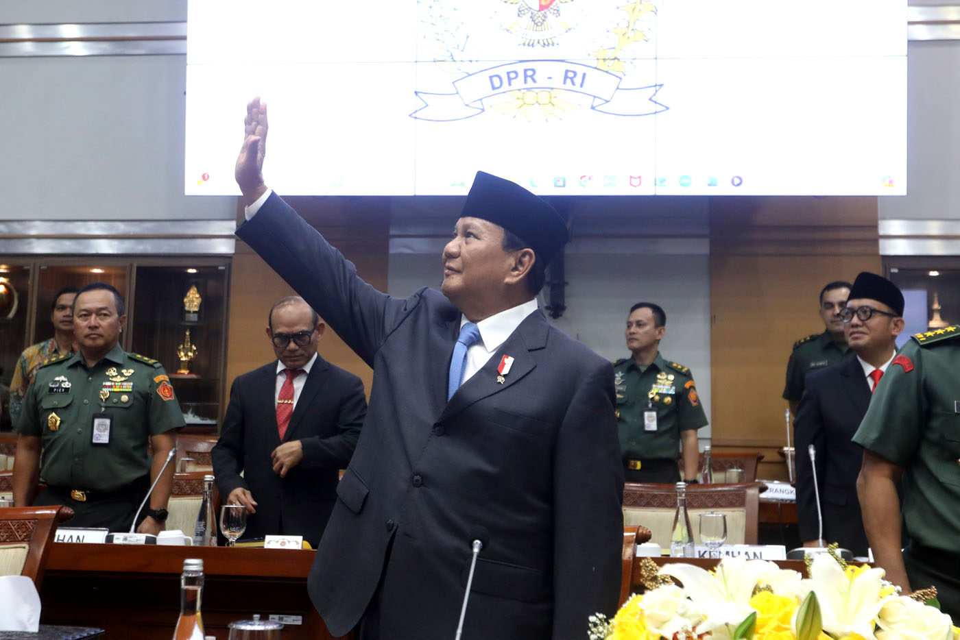 Menteri Pertahanan sekaligus presiden terpilih RI Prabowo Subianto (tengah) melambaikan tangan ke arah wartawan sebelum mengikuti raker dengan Komisi I DPR RI, di Kompleks Parlemen, Senayan, Jakarta, Rabu (25/9/2024). (Salman Toyibi/Jawa Pos)