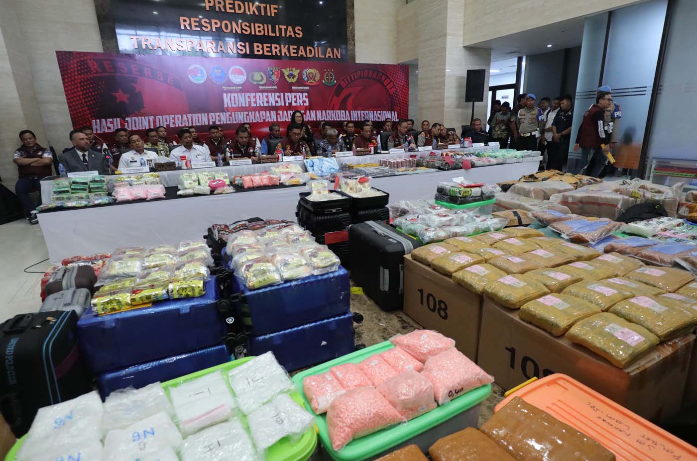 Kabareskrim Polri Komjen Wahyu Widada (tengah) didampingi perwakilan lembaga terkait menyampaikan keterangan terkait pengungkapan jaringan narkoba dalam konperensi pers di Bareskrim Polri, Trunojoyo, Jakarta, Jumat (1/11/2024). (Fedrik Tarigan/ Jawa Pos)