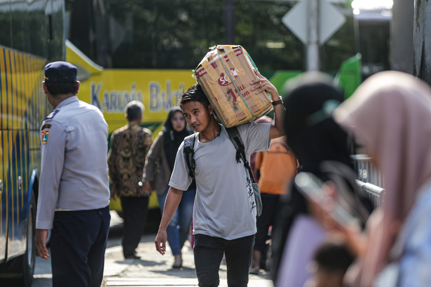 Sejumlah pemudik arus balik saat tiba di Terminal Kampung Rambutan, Jakarta, Senin (15/4/2024). Kedatangan penumpangdi Terminal Kampung Rambutan, Jakarta Timur pada arus balik mudik Idulfitri 1445 Hijriah melonjak dibanding Idulfitri 2023. Kepala Terminal